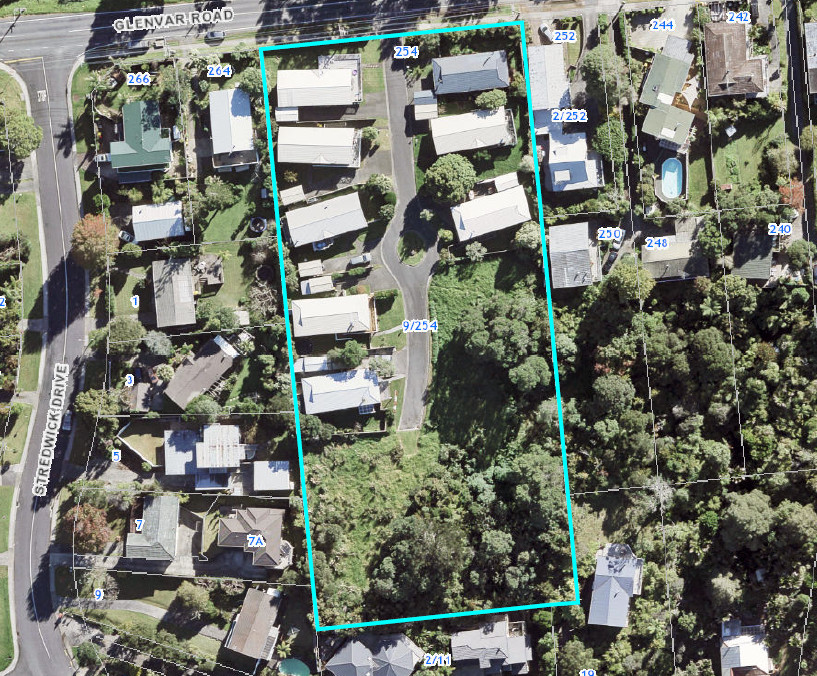 A vacant 4047 sq m development site situated to the rear of an existing 8 unit crosslease development fronting onto Glenvar Road, in the established residential suburb of Torbay on Auckland’s North Shore.